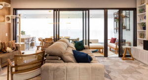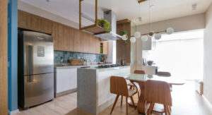 Um painel da sala pode se estender até a cozinha e virar armário aéreo, criando continuidade no design e sensação de unidade.